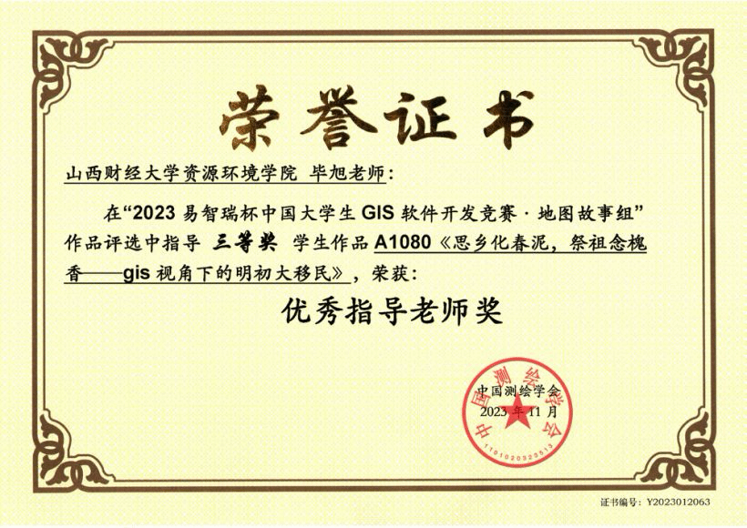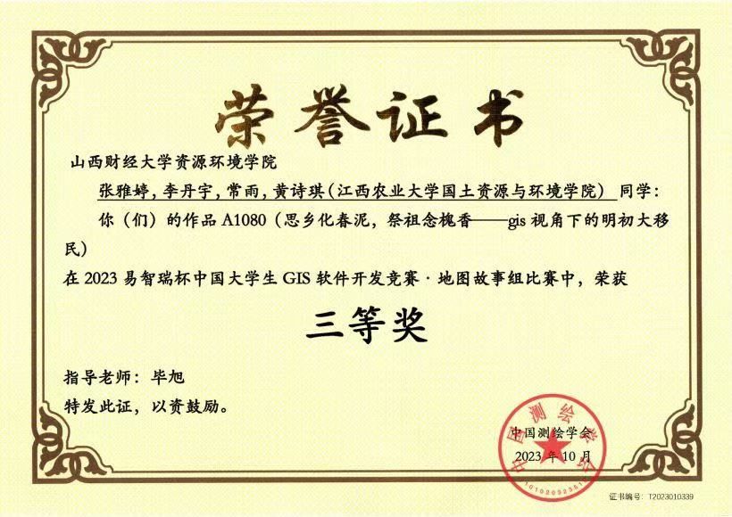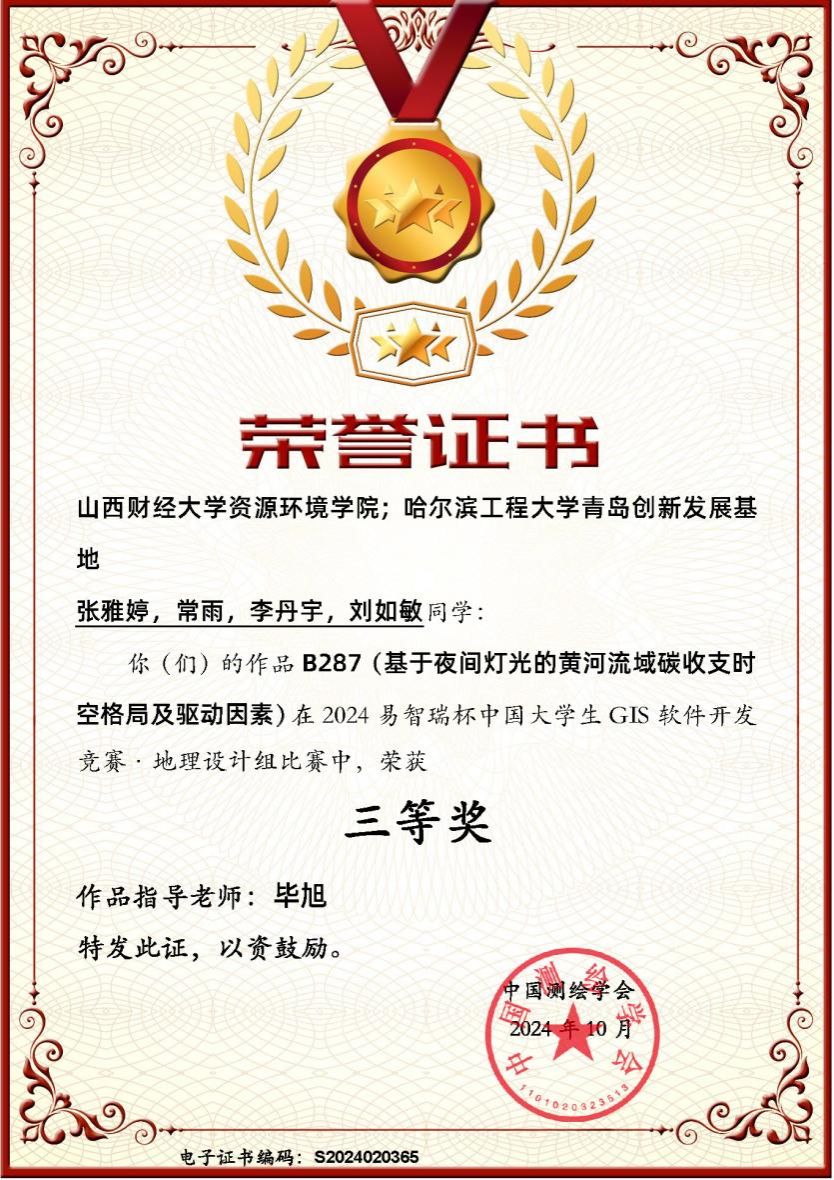 2024年“易智瑞杯”中国大学生GIS软件开发竞赛评选结果正式揭晓!365英国上市公司2021地理信息科学专业张雅婷、常雨、李丹宇三位同学的作品《基于夜间灯光的黄河流域碳收支时空格局及驱动因素》荣获地理设计组三等奖。其中,该团队成员在2023年“易智瑞杯”中国大学生GIS软件开发竞赛中作品《思乡化春泥,祭祖念槐香——gis视角下的明初大移民》荣获地图故事组三等奖。以上荣誉不仅是对团队成员辛勤付出的肯定,更是对我院在培养高素质GIS人才方面所取得成绩的认可。指导教师毕旭老师荣获“优秀指导老师”奖项,她的专业指导和无私奉献为团队成功奠定了坚实的基础。