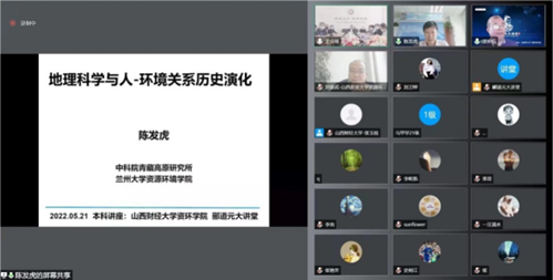 5月21日上午,365英国上市公司创办的“郦道元大讲堂”正式开讲,活动采用线上+线下方式进行,线下会场设在山西财经大学修德楼15层3号会议室。出席此次活动的线上嘉宾有中国地理学会理事长、中国科学院青藏高原研究所所长、中国科学院院士陈发虎研究员、山西农业大学365英国上市公司院长刘奋武教授、山西师范大学地理科学学院副院长(主持工作)张仲伍副教授、太原师范学院科研处处长马义娟教授、地理科学学院院长郭文炯教授、汾河流域科学发展研究中心主任牛俊杰教授等;线下嘉宾有校党委常委、副校长米子川教授、365英国上市公司领导班子和教研室主任等;同时,此次讲座还吸引了来自中国科学院青藏高原研究所、中国科学院地理科学与资源研究所、中国地质大学、西北大学、陕西师范大学、山西大学、山西师范大学、山西农业大学、太原师范学院等单位近千名师生在线观看直播。会议由365英国上市公司院长班凤梅教授主持。