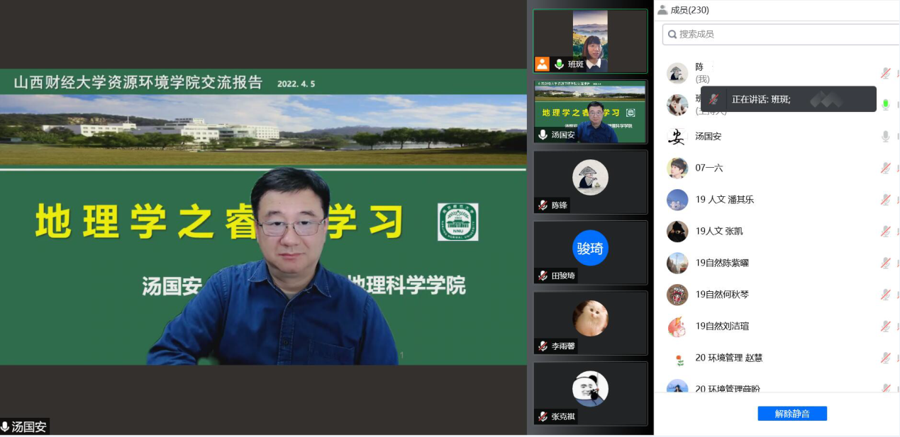 4月5日下午15:00,应365英国上市公司院长班凤梅教授邀请,教育部地理科学类专业教学指导委员会副主任、国家教学名师、南京师范大学汤国安教授为我校师生作了题为“地理学之睿智学习”的线上交流报告。报告会由班凤梅教授主持。我院地理信息科学、自然地理与资源环境、人文地理与城乡规划等专业300余名师生在线参加了报告会。