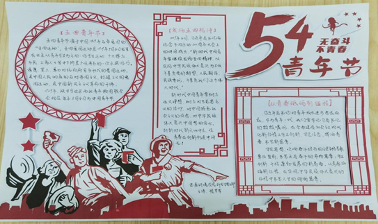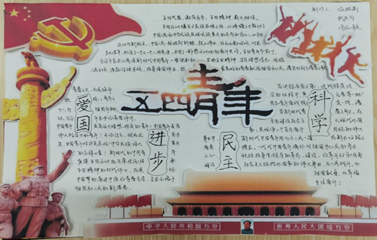 “五四春雷人觉醒,雄狮怒吼震西方。”走进中国特色社会主义新时代,“五四精神”有了更加深厚的历史意义和积极的时代价值。活动旨在以五四青年节为契机,营造“人人参与、动手入心”的学习氛围。通过精心编排,认真绘写,制作了一幅幅图文并茂的手抄报,已满怀着爱党、爱国的赤子之心,用一幅幅手抄报表达了爱国之情、青年之志。