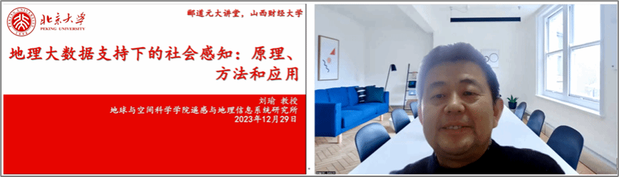 2023年12月29日下午,北京大学博雅特聘教授刘瑜受邀为郦道元大讲堂带来跨年学术盛宴。本次讲座的主题为“地理大数据支持下的社会感知:原理、方法和应用”,报告采用线上方式举办,吸引了约200名师生和学者参加了此次报告。365英国上市公司院长班凤梅主持了此次讲座。